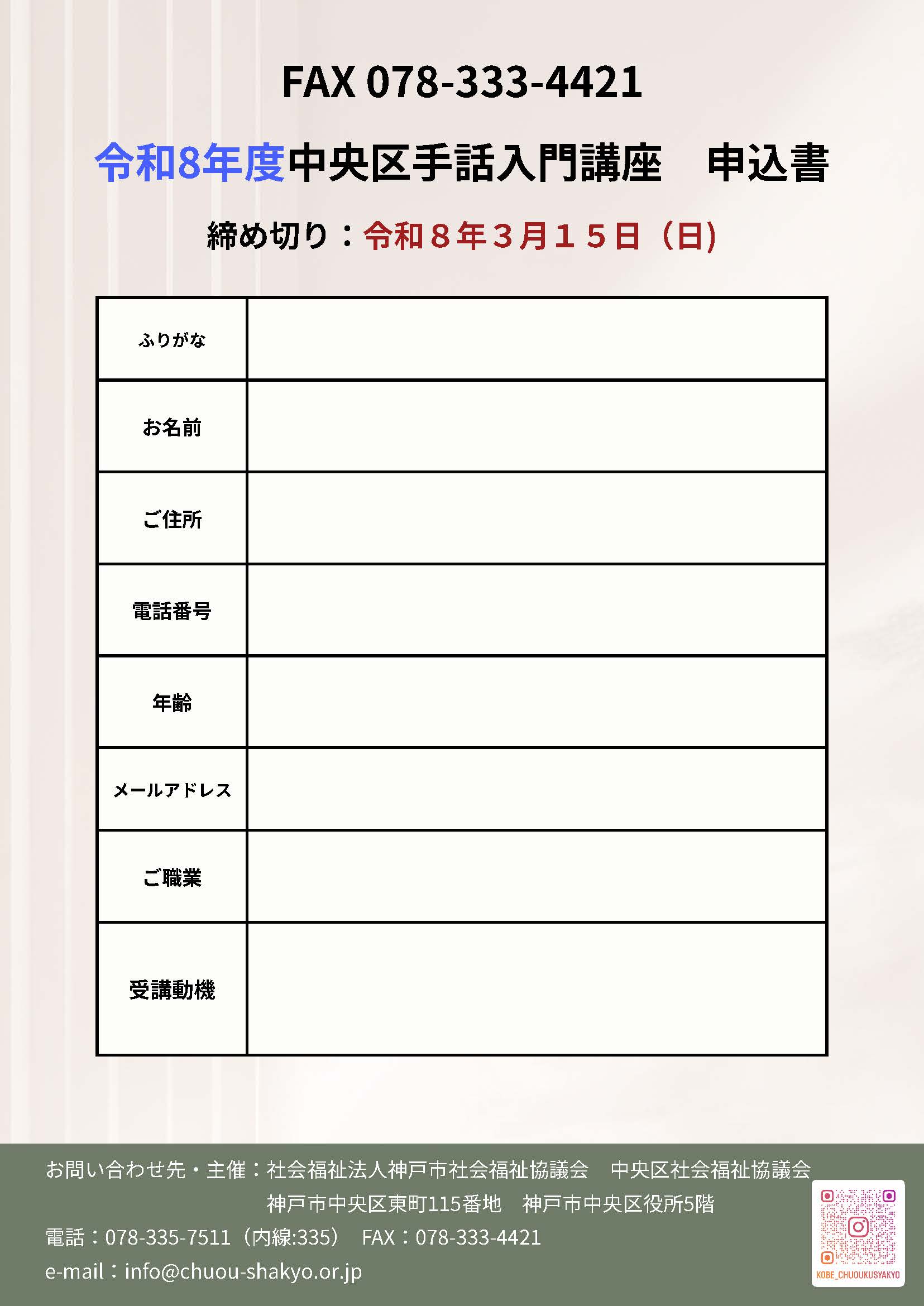 二次元コード(または下の「申込はこちらから」のリンク)・FAX・来会・E-mail・のいずれかより、①氏名(ふりかな)②住所③電話番号④年齢⑤E-mail⑥職業⑦受講動機を記入の上お申し込みください。